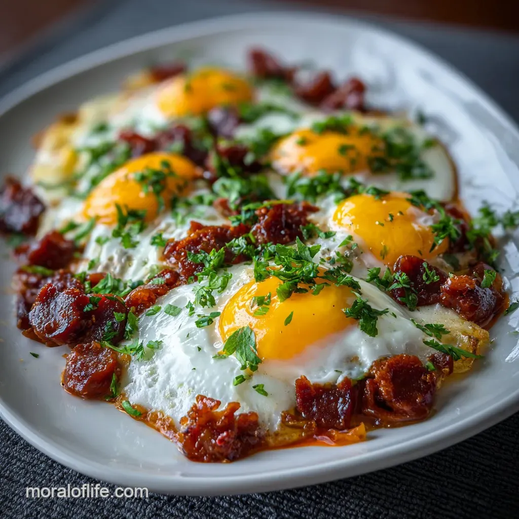 Huevos Rotos (broken eggs) is a classic Spanish dish. It typically involves fried eggs served over fried potatoes, with sliced chorizo often added for extra flavor and substance.