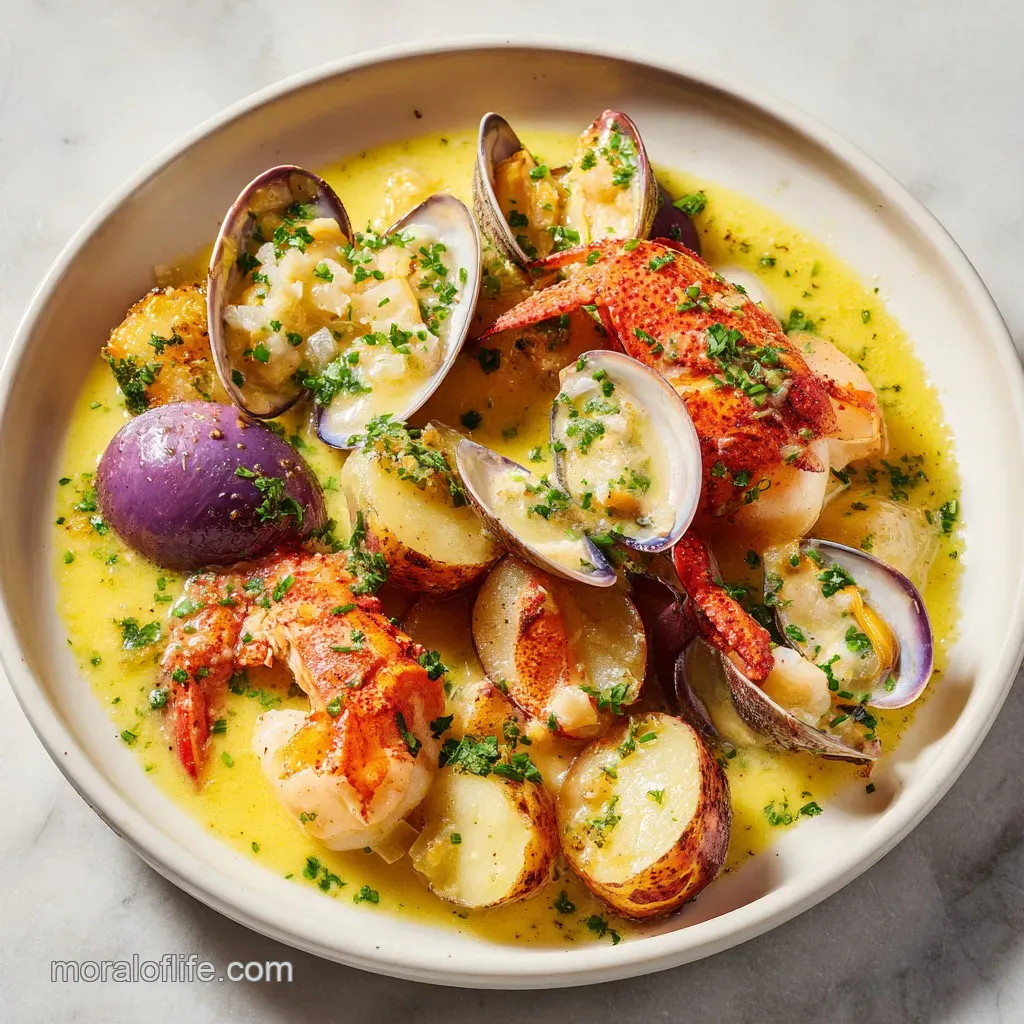 Seafood boils are a balance of earthy vegetables and brine forward proteins. The mixture centers on tender baby red potatoes, sweet corn cob pieces, and savory andouille sausage paired with succulent jumbo shrimp and snow crab legs, all seasoned with a bold, emulsified garlic butter sauce.