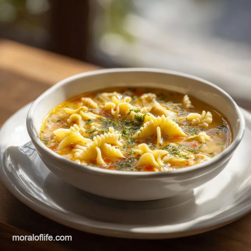- Flavor/Texture Hook: Savory herb infused broth with tender chicken and silky pasta stars.